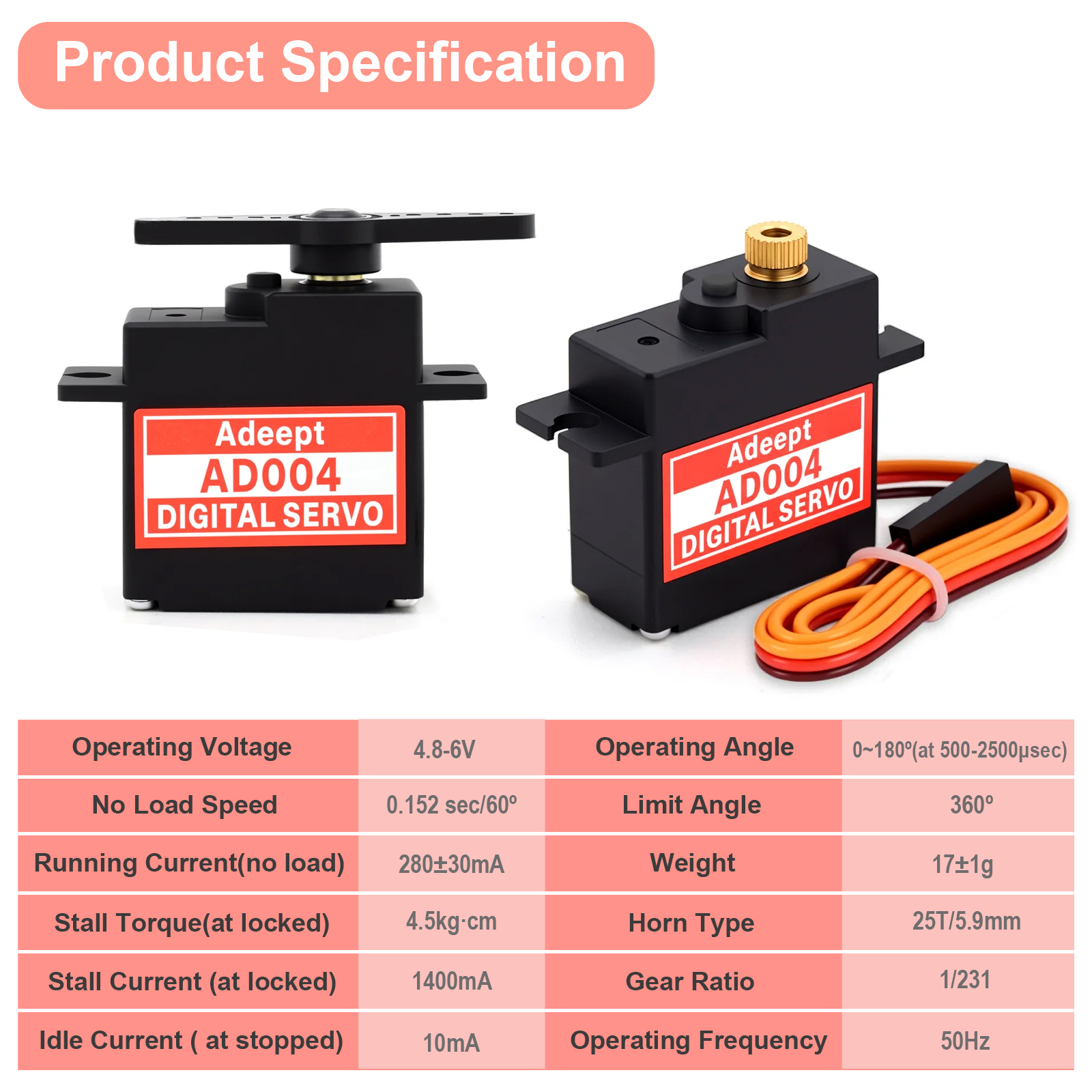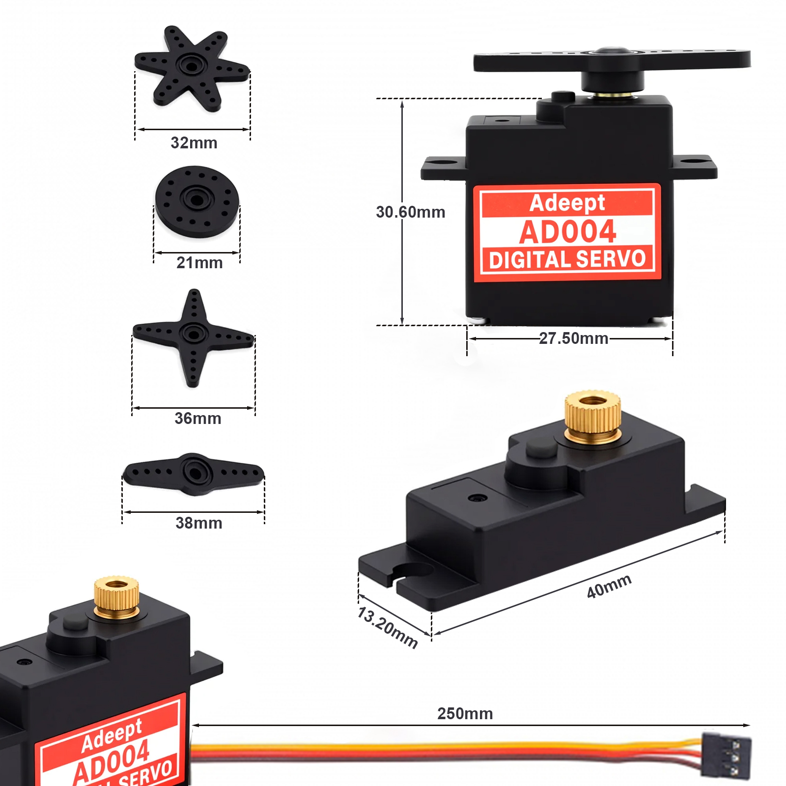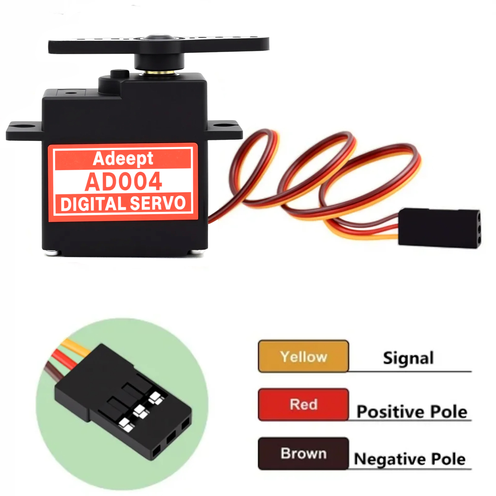 Out of the box, the servo is equipped with a 250mm PVC cable (with red/Vcc, black/GND, yellow/Signal wiring) and a standard 25T output shaft, ensuring easy installation. Experience precise control for your aircraft, cars, boats, and other automated creations with the dependable AD004 Micro Digital Servo.